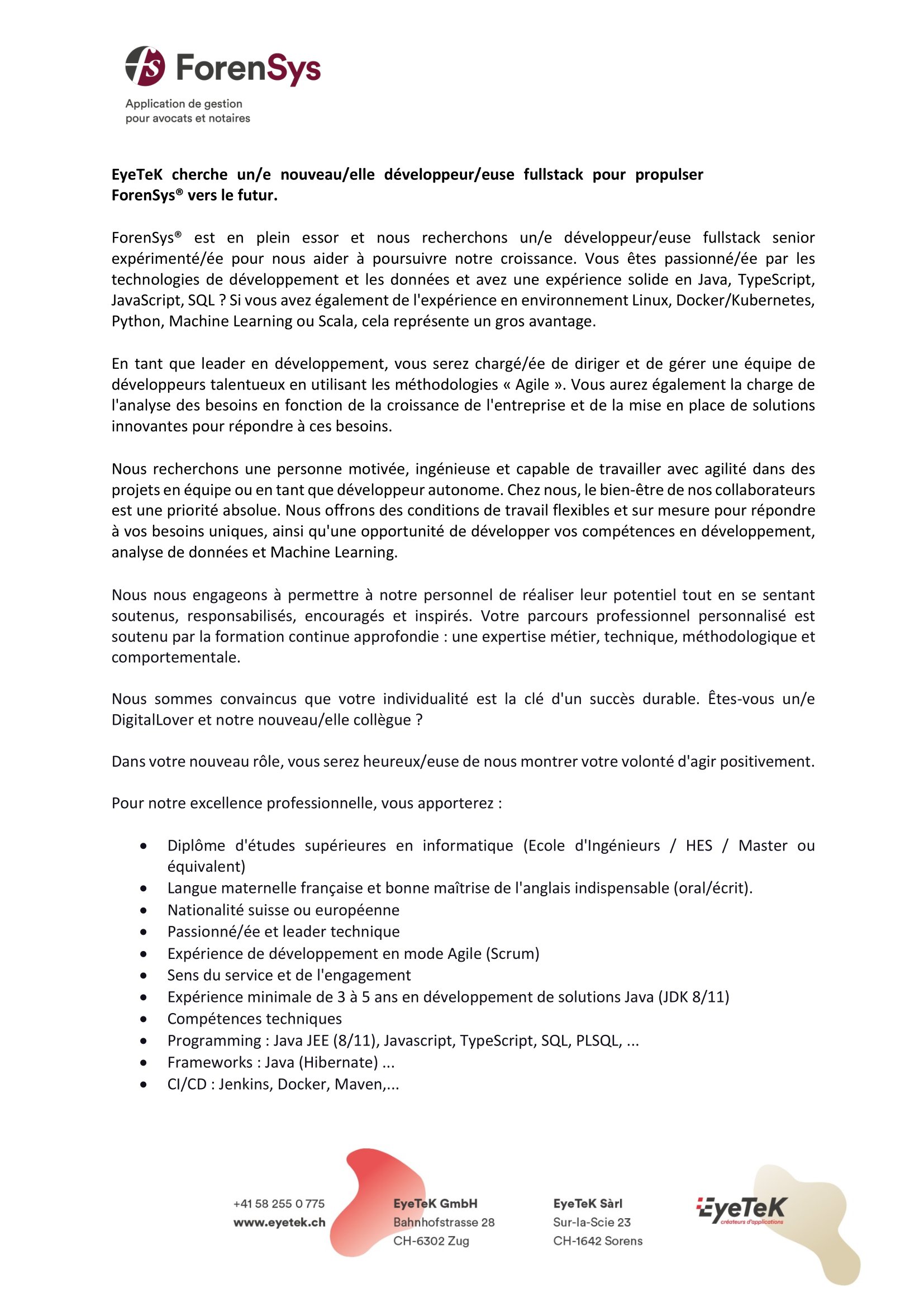 Rejoignez notre équipe dynamique et innovante et participer à la conception et au développement de notre ERP "ForenSys", notamment dédié à la gestion d'études d'avocats et notaires.